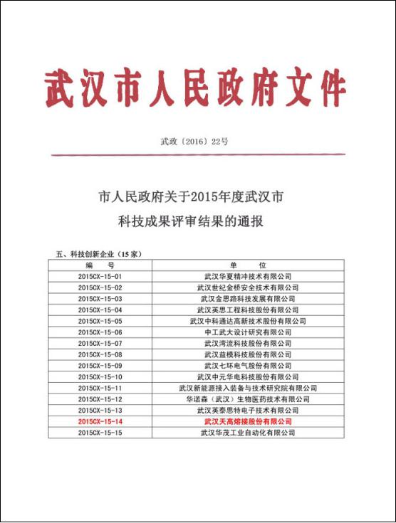 近日,根據(jù)《市人民政府關(guān)于2015年度武漢市科技成果評(píng)審結(jié)果的通報(bào)》文件,為進(jìn)一步調(diào)動(dòng)廣大科技者的積極性,經(jīng)有關(guān)單位組織推薦、專家評(píng)審、市科學(xué)技術(shù)獎(jiǎng)勵(lì)委員會(huì)綜合評(píng)定,對(duì)天高股份等15家2015年度武漢市科技創(chuàng)新企業(yè)予以通報(bào)。近年來(lái),面對(duì)日新月異的焊接新技術(shù),天高股份始終以推動(dòng)科技創(chuàng)新為宗旨,系統(tǒng)提升科技創(chuàng)新能力,以創(chuàng)新引領(lǐng)人才隊(duì)伍建設(shè),以人才促進(jìn)企業(yè)持續(xù)發(fā)展。通過(guò)持續(xù)的創(chuàng)新活動(dòng),天高股份的業(yè)務(wù)領(lǐng)域