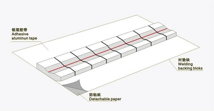一般陶質焊接襯墊中間都會有一條紅色的對準線(不包括圓柱那種),貼的時候對應板縫中間。還有一點很正要,貼襯墊的時候一定要把鐵板表面的灰塵清理干凈,要不會貼不緊,焊接的時候容易脫落。
